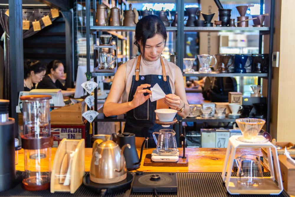 7月1日,在湖南高桥大市场的“咖啡一条街”,玖秀咖啡负责人肖雍琪在冲泡咖啡。新华社记者 陈思汗 摄
