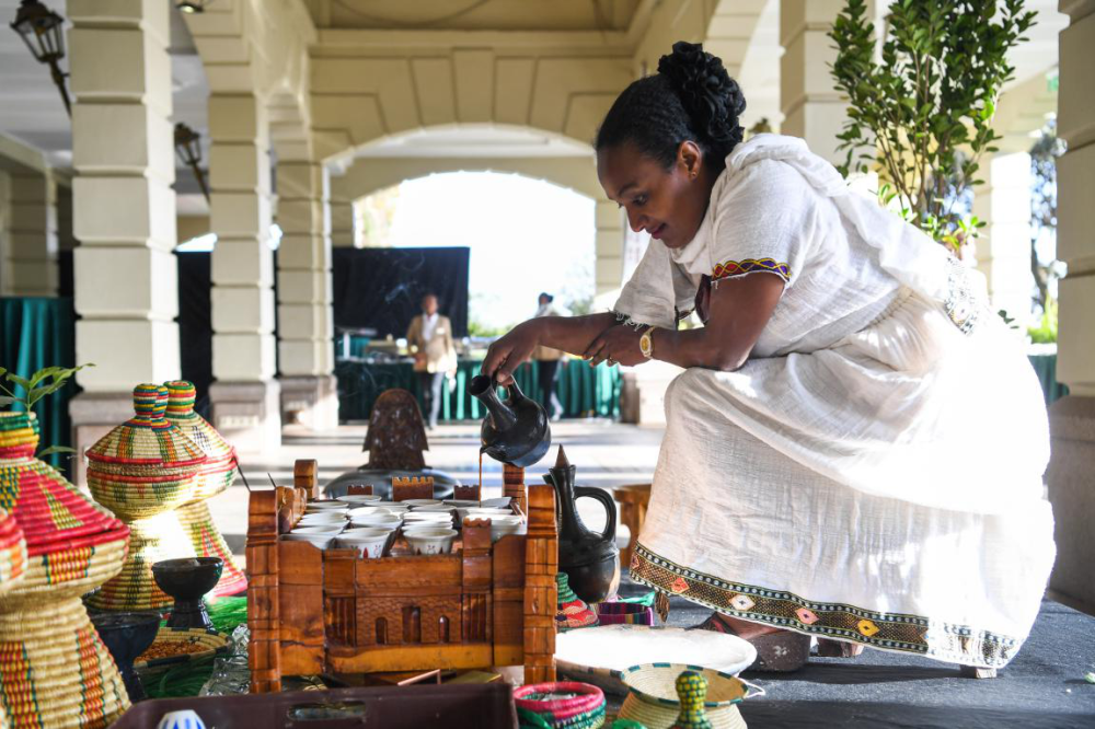 2月13日,在埃塞俄比亚首都亚的斯亚贝巴,一名妇女在冲泡当地传统咖啡。新华社发(迈克尔·特韦尔德摄)