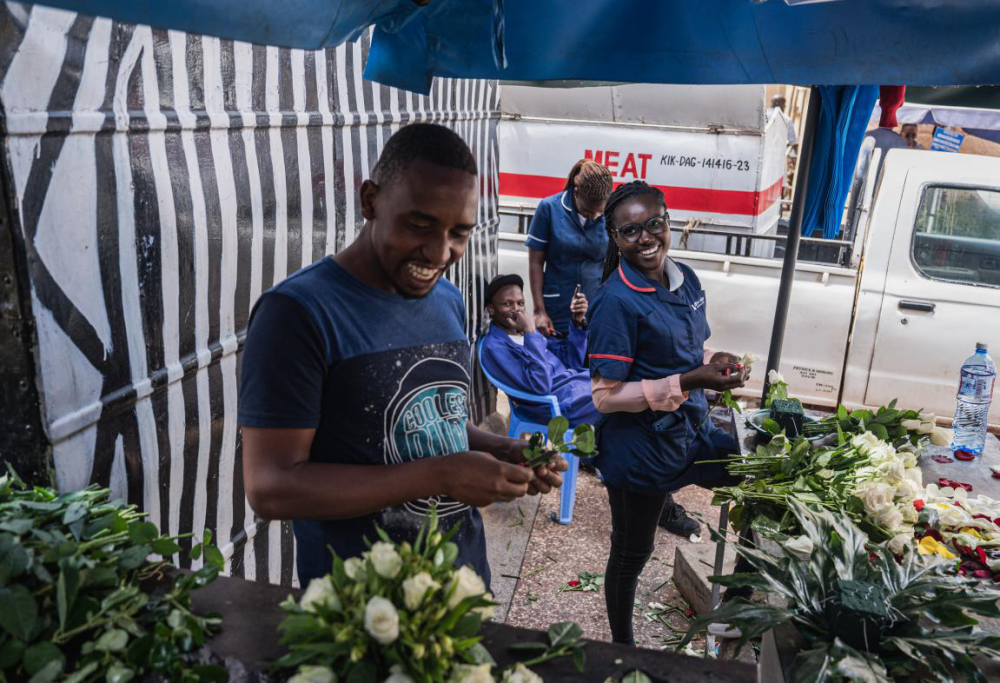 7月10日,在肯尼亚首都内罗毕的一个市场,商贩在修剪待售的鲜花。新华社记者 王冠森 摄