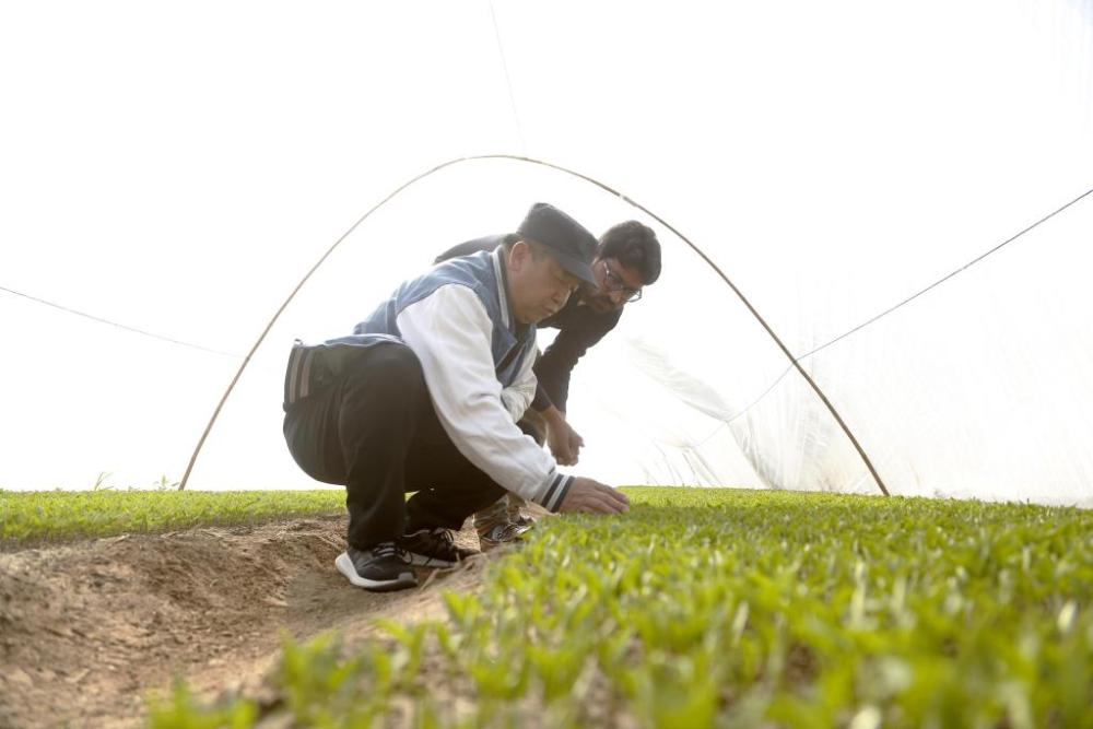 巴基斯坦旁遮普省木尔坦的中巴辣椒订单种植项目辣椒育苗大棚内,中国农业专家带领巴基斯坦技术员查看辣椒秧苗生长情况。
